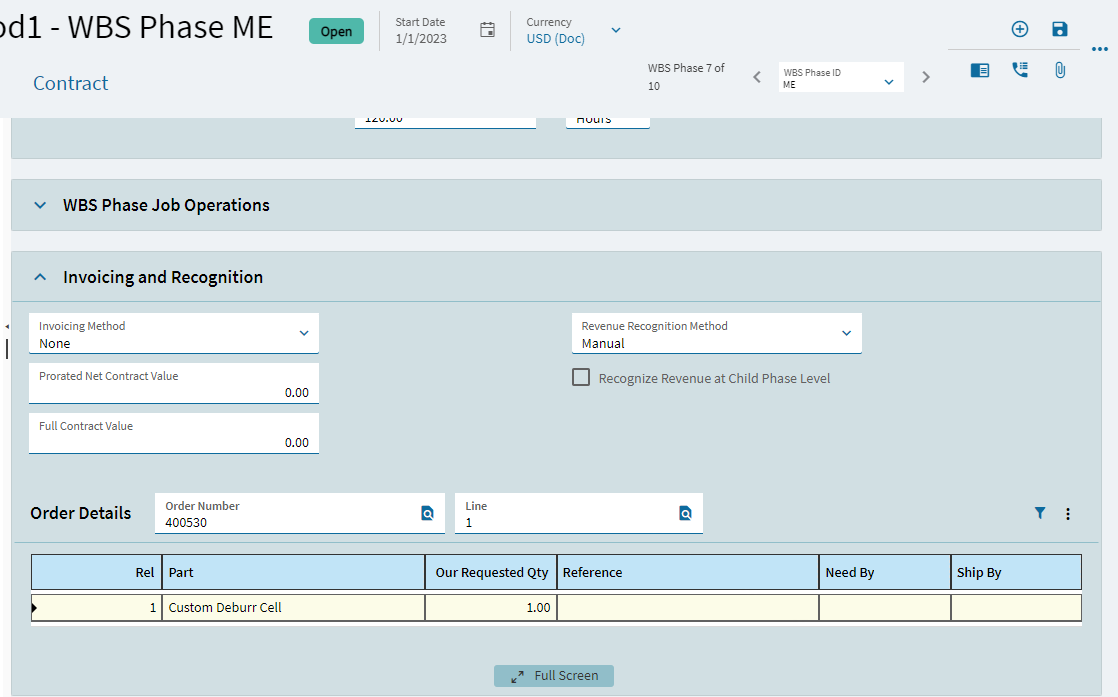Playing in projects, I added an order number and line under “invoicing and recognition” - but it’s under the wrong WBS phase.