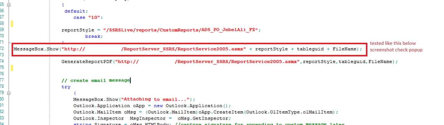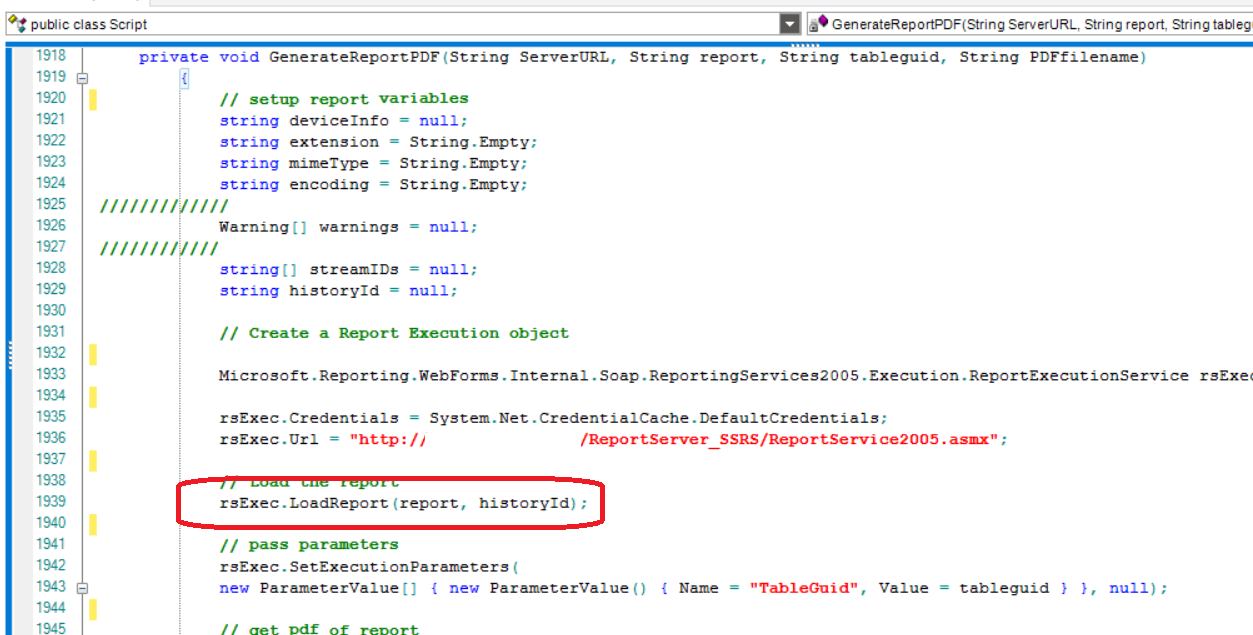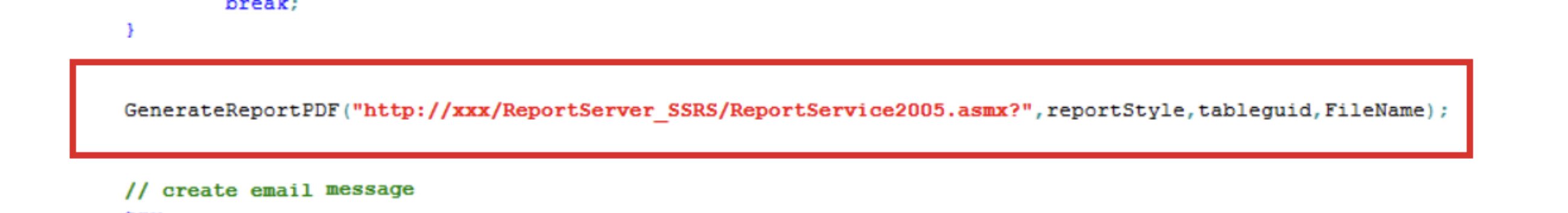 hmmm, I am wonder if it is the server URL or the filename causing the issue. You could put some messageBox.Show calls in to see where in the GenerateReportPDF method it breaks.