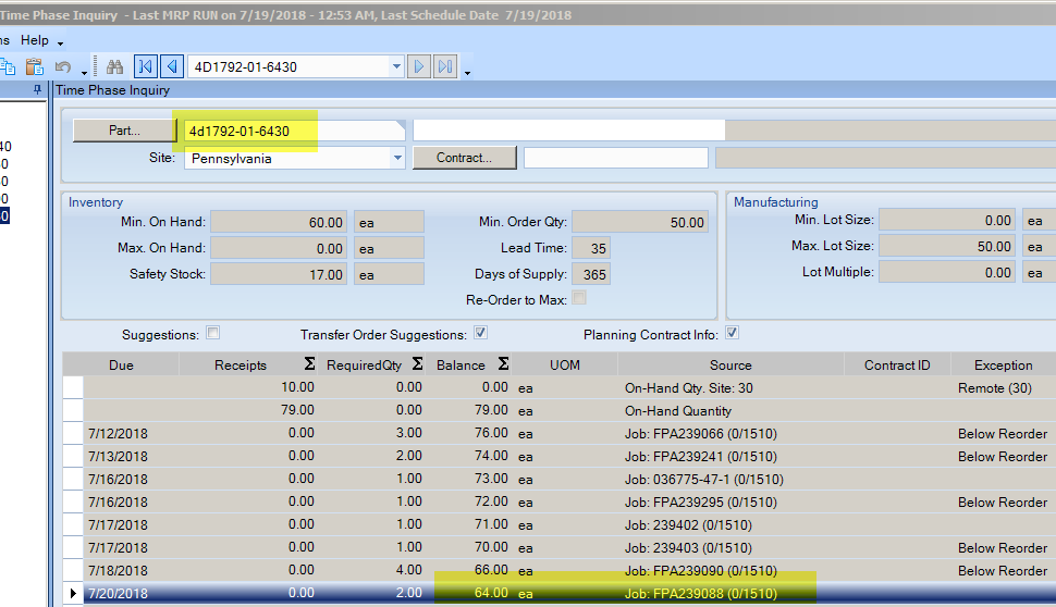 I see you are using the Production Planning workbench data in your note above. Can you provide any clarification on the usability of this data/tool? I am struggling to see how it works. Here’s an example of an error, it claims that i have a shortage on part 4d1792-01-6430, for job FPA239088 but looking at timephase I have 66 on hand at time of job requirement. I ran the prod planner process with cutoff August 31.
