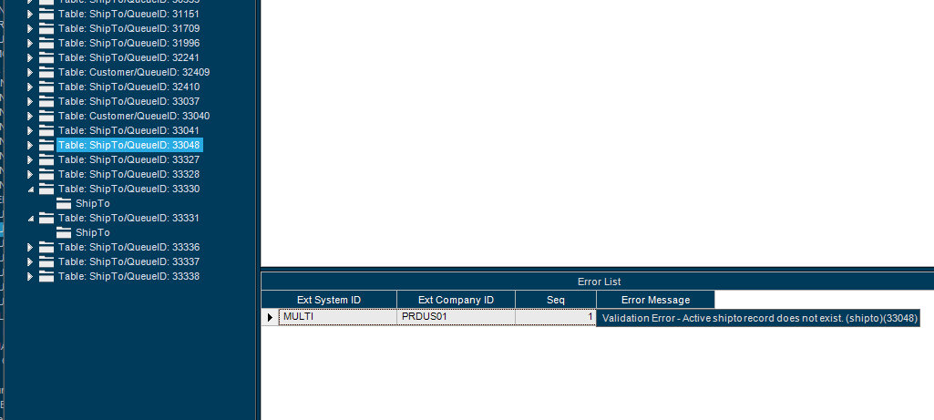 I have been having issues with global customers for the last couple weeks. I’ve solved a lot of the problems, however for a number of new ship-to’s, I get the following validation error in Integrated Table Workbench. How would I go about fixing the Active Shipto record does not exist?