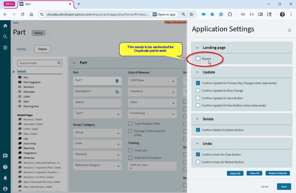 - “BUG” if you tick bypass landing page on part and then load a part and click duplicate part you get a white screen - EpicCare are aware of the bug.