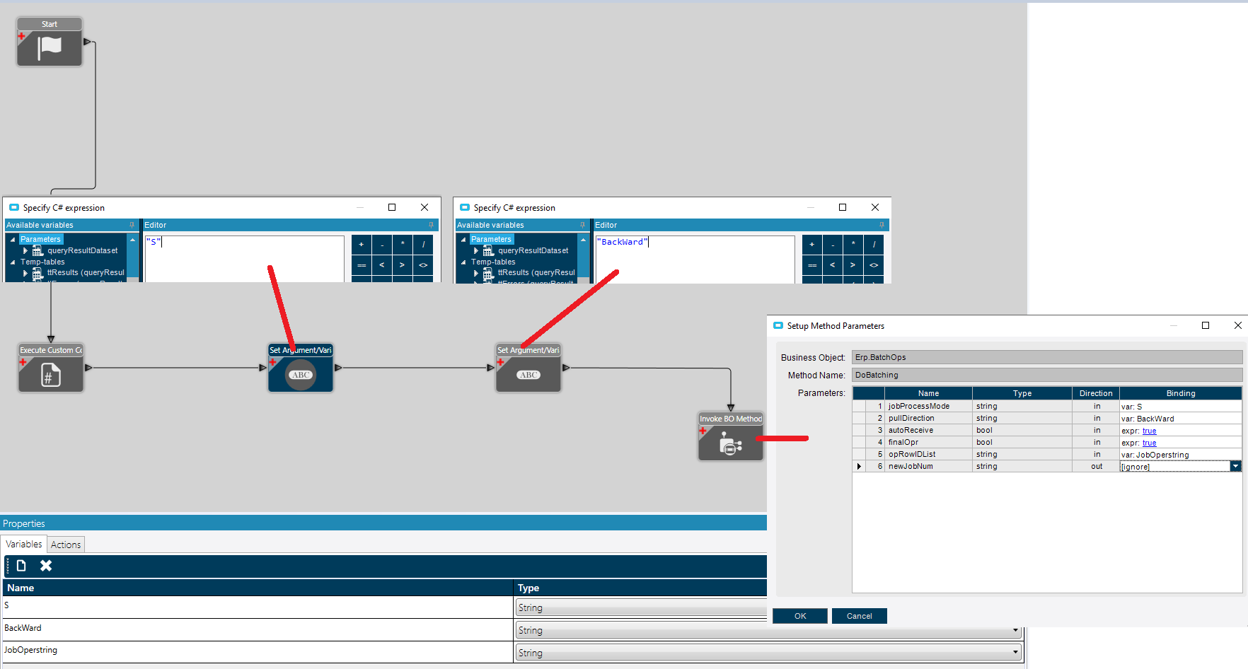 In the BPM Designer Create 3 new variables - we used S , BackWard and JobOperstring.