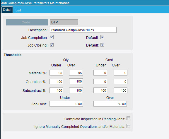These codes direct the Epicor application to automatically complete or close several jobs at once without further review. This allows you to complete or close jobs by exception, as only jobs that do not fall within the threshold of a specific code need to be reviewed.