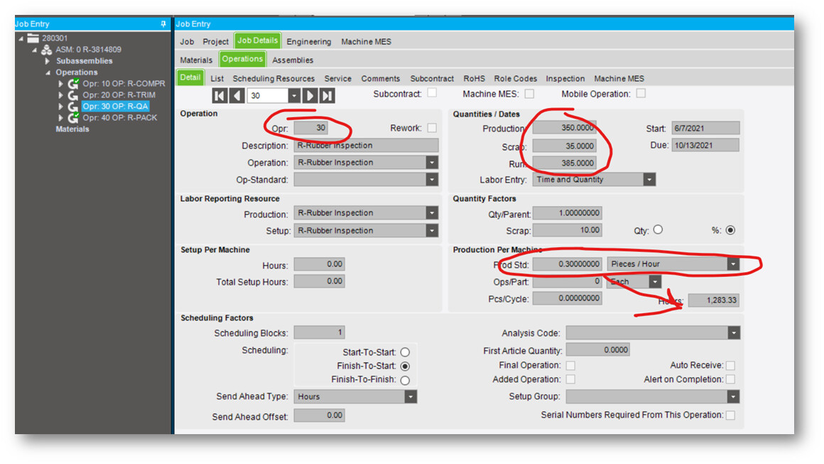 Is the operation supposed to be set to 0.3 pieces per hour? It also looks like the job is for 350 pieces, so I would expect a very long runtime if it takes 3 hours to process each part.