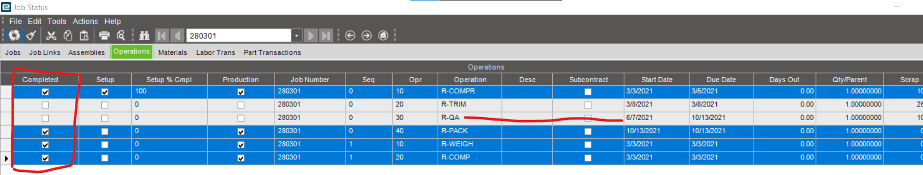 Looking to confimr whati think may be happening. I hate a job that has a couple operations completed already. 1 particular operation is taking months when it should be a few days at most. I was just brought into this so i do not have all the details. Reverse engineering this one. Is it possible that the reason why the resource is being dragged out is because the job had operations completed in error? If i change the BOM and re run the details on this job and schedule it manually to the 3/3/21 date it does not change (assuming due to the transactions against the job. Please and thank you in advance!