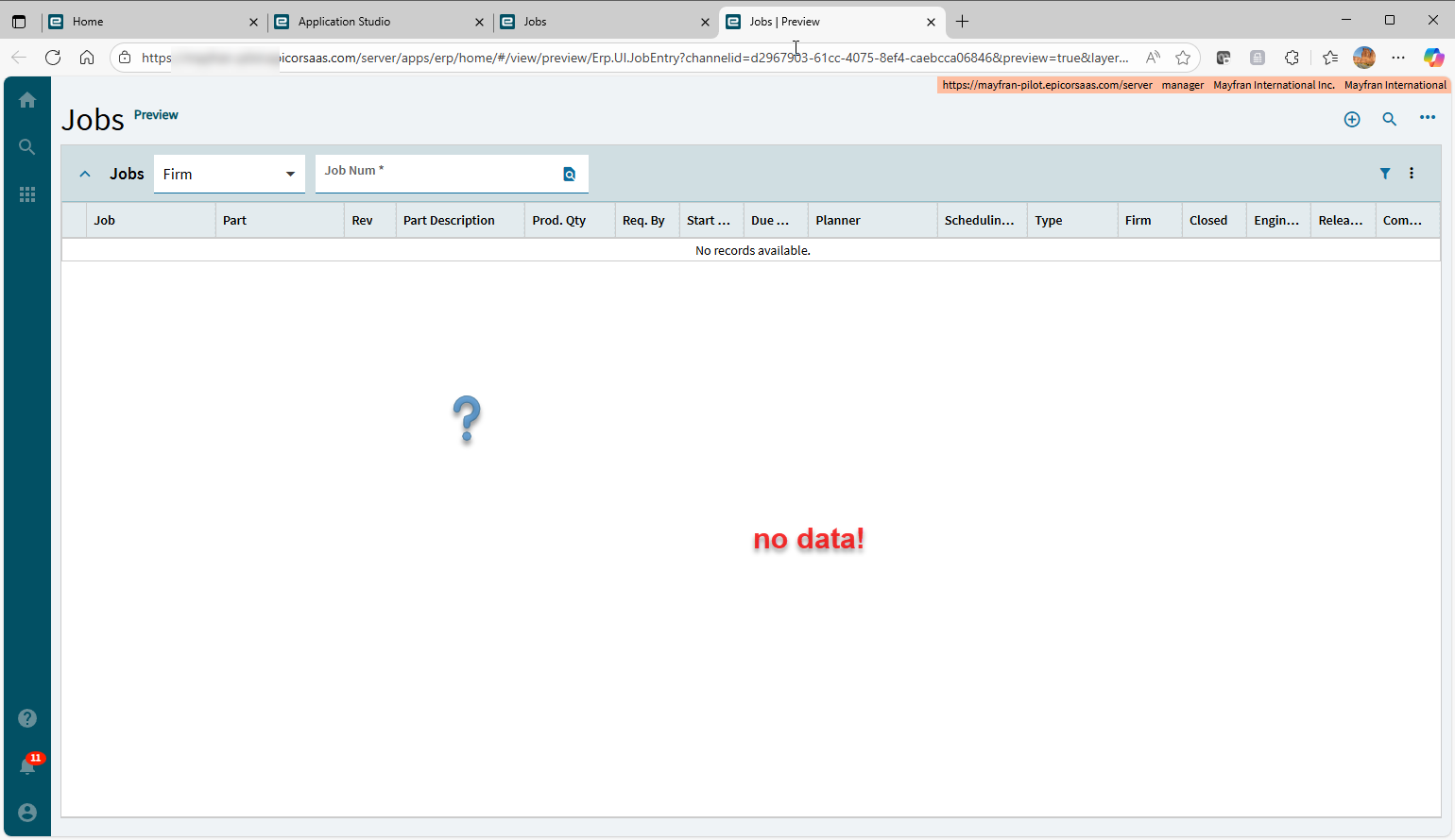 I am trying to add a couple of simple fields to a form customization on the Job Entry form. I was not seeing any data on the landing page so I started from scratch from the base layer and I am still not seeing any data in preview mode. So I deleted my custom layer, called up Job Entry in App Studio, created my new layer, saved it, and did a preview. So this should be just base functionality - nothing I added. When I preview it, there are no jobs in the landing page. When I call this form up from the menu (no customizations on it) it works fine. But in App Studio it does not show any data. I am new to using App Studio and we just took a course last week so I am trying to do a simple customization.