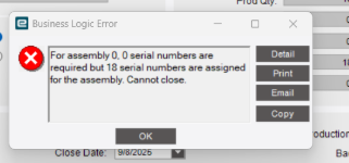We have a job that was created, and then serial number tracking added in part entry after the fact… Quantities were completed against the job and we went to close the job and it is telling us 18 assigned and 0 required.