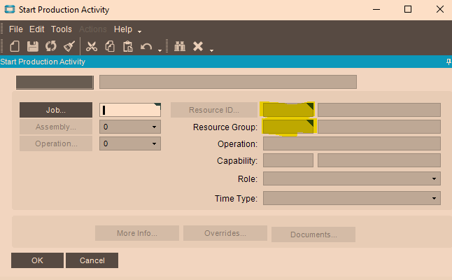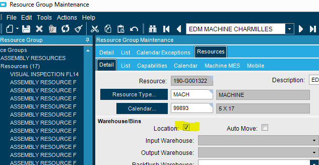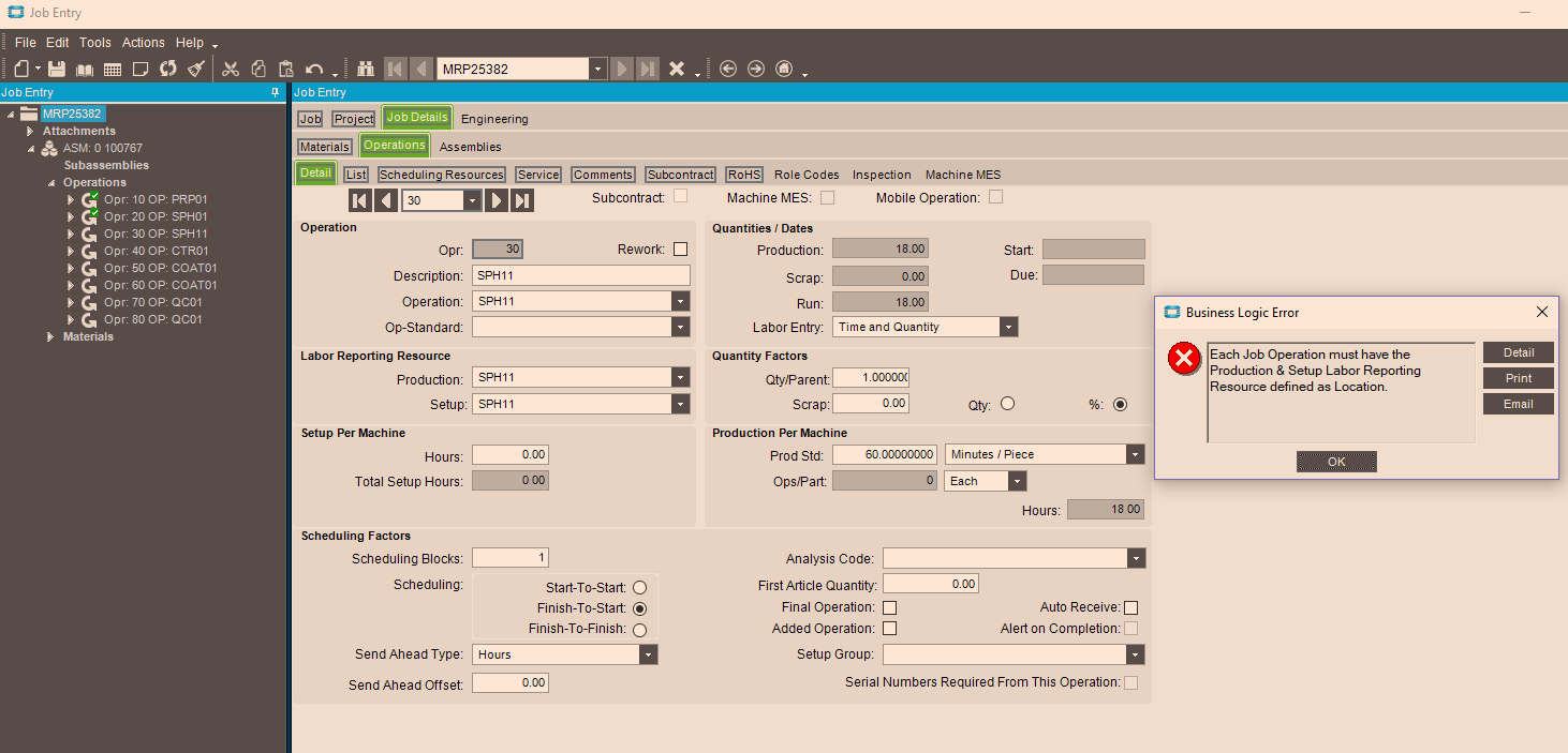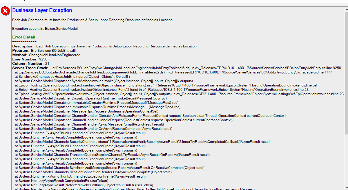 Users clocked into the first two sequences of this job normally. The third sequence does not allow the user to clock in and gives an error that says “Each Job Operation must have the Production & Setup Labor Reporting Resource defined as Location.”