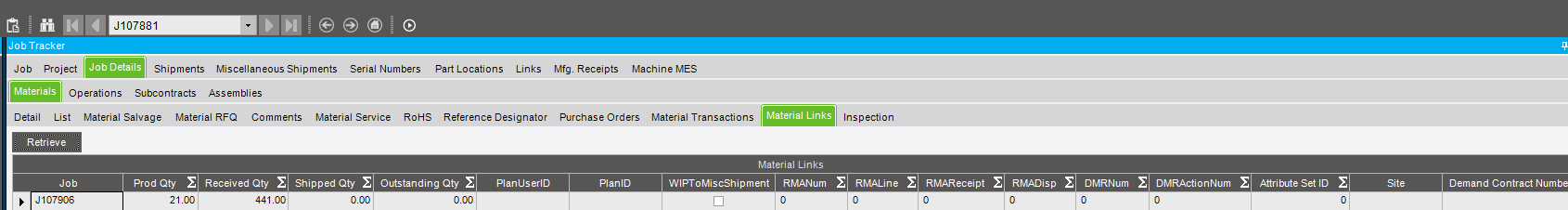 One of the operators has done a job receipt to job transaction where the production quantity was for 21 but the receipt quantity was 441. This has done two transactions: