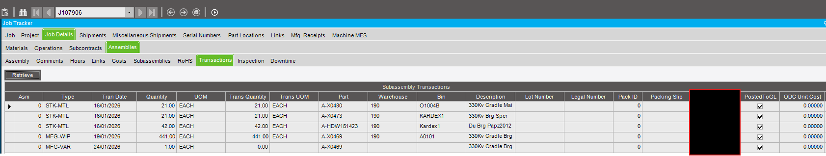What is the best way to reverse the transactions? I did a job adjustment and posted a -420 on the parent job J107881 but that has posted a negative adjustment at 0 cost, and I can’t figure out what to do with the job J107906 where the over receipt happened.