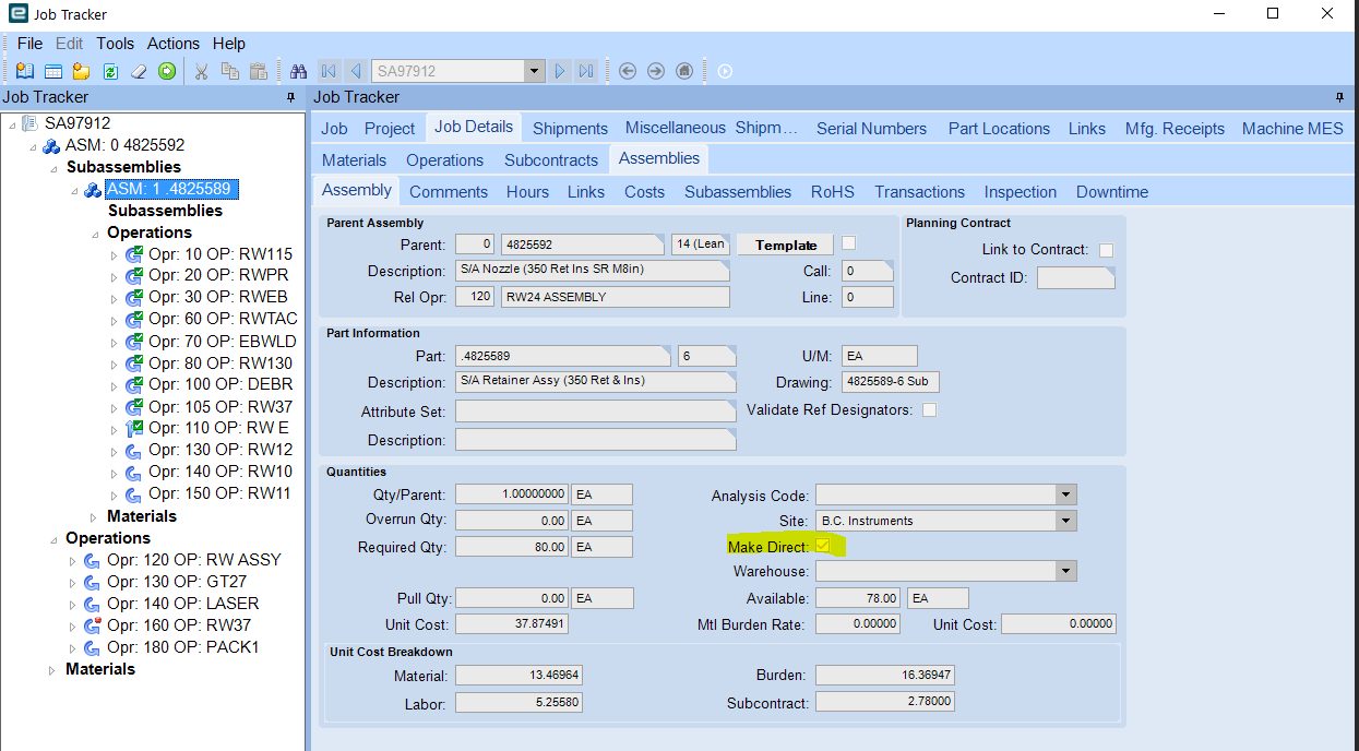 on the Job Details> Assemblies>Assembly screen, all assemblies should be set to make direct.