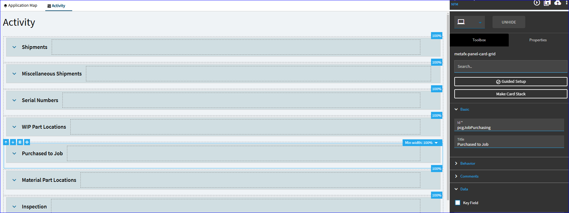 I added a Panel Card Grid to the middle titled “Purchased to Job”.
