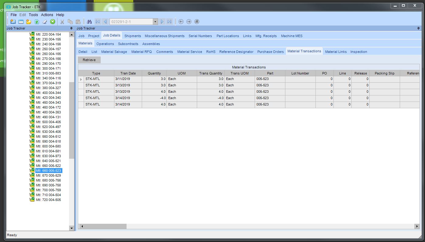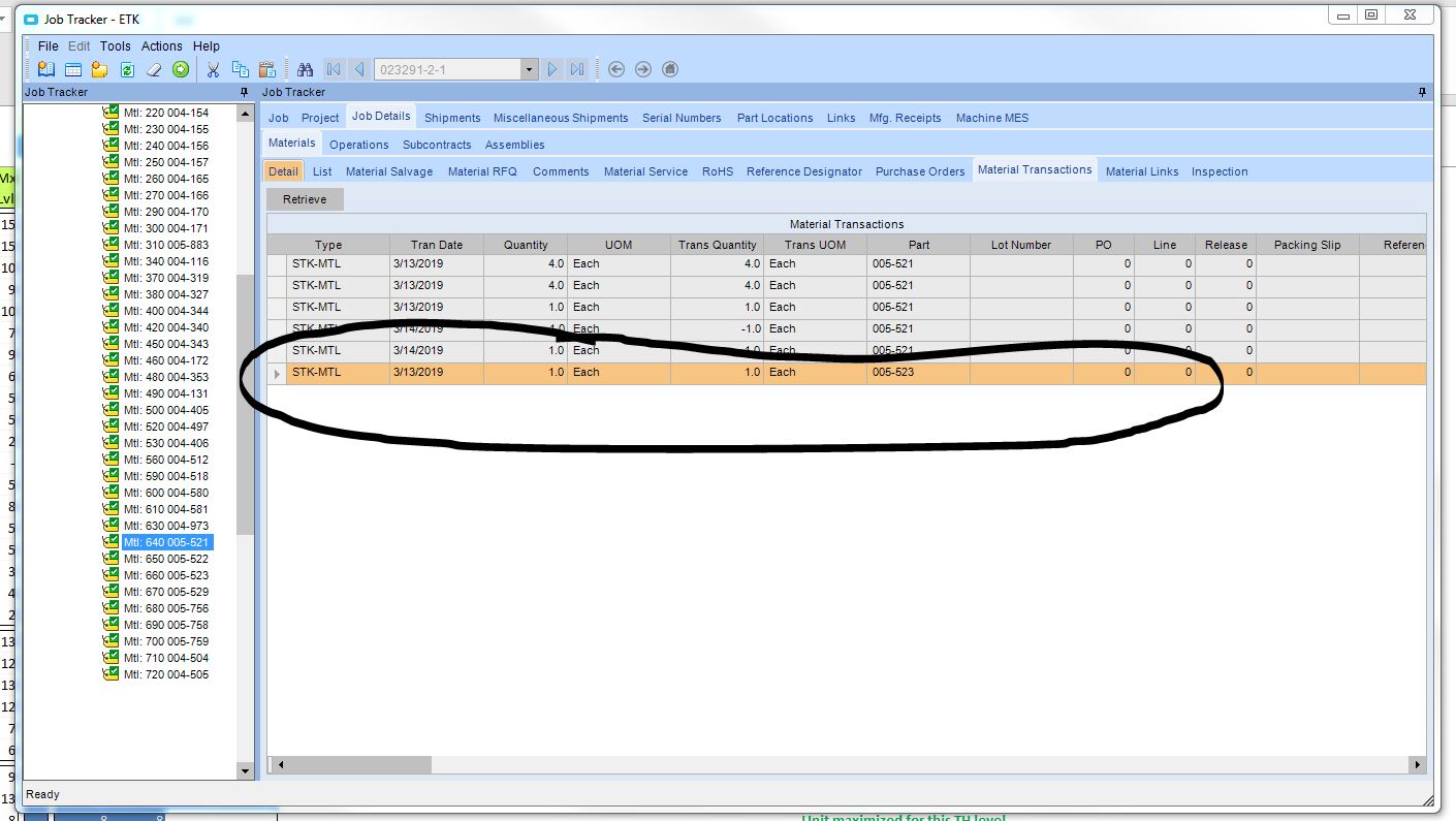 Can you screenshot the job material line transaction grid from Job Tracker. Does it show any additional transaction types?