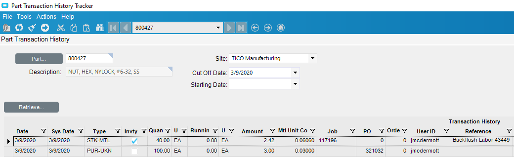 Because this part isn’t inventory, and it’s QOH may not actually match the actual amount, a qty adj can be dine using the reason code created above. This will reduces the QOH, but cause no change to the GL (it would credit and debit the same account).