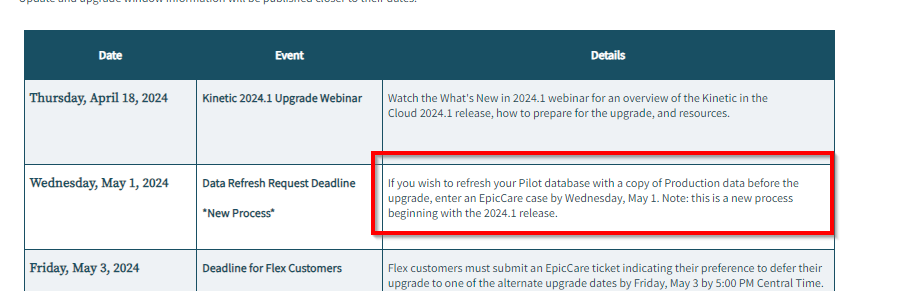 Kinetic - Americas For customers on cadence, the Kinetic 2024.1 Pilot upgrade scheduled for this weekend has been postponed and a new upgrade date will be communicated.