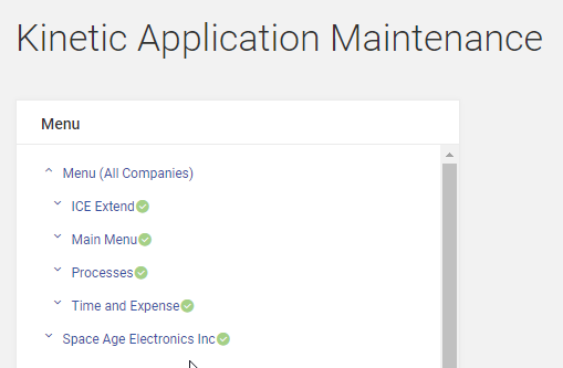 When you’re in Kinetic App. Maintenance - if you collapse everything do you see one that’s Menu (All Companies) and another for your specific company? If you copy a menu item to your company, it disappears from the All Companies list and shows under the company you copied it to. So you may need to turn Kinetic off for your company as well as All Companies.