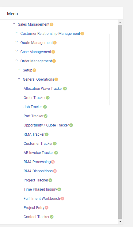 Same patch level. Odd that I don’t see all the menu items under each folder item in Kinetic Application Maintenance. For example, in Order Management, all I see is Part Tracker?