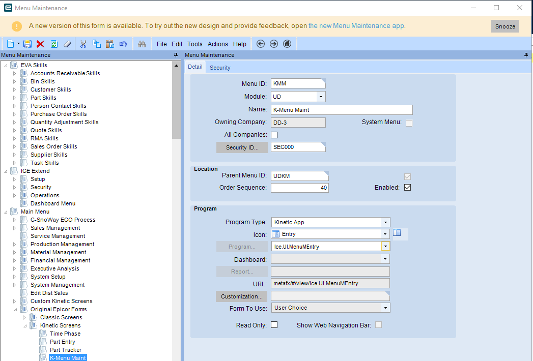 If only I could open the Menu Maintenance (Kinetic Version). Epicor has a mind of it’s own and opens the classic version, no matter what my personal preferences are. In previous versions, I used Kinetic Application Maintenance to force Menu Maintenance to open in the Kinetic Version. Now I’m stuck, unless that silly banner at the top shows up randomly asking if I want to open the kinetic version.