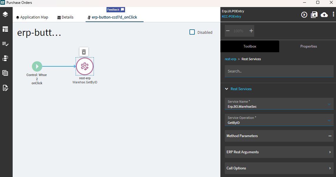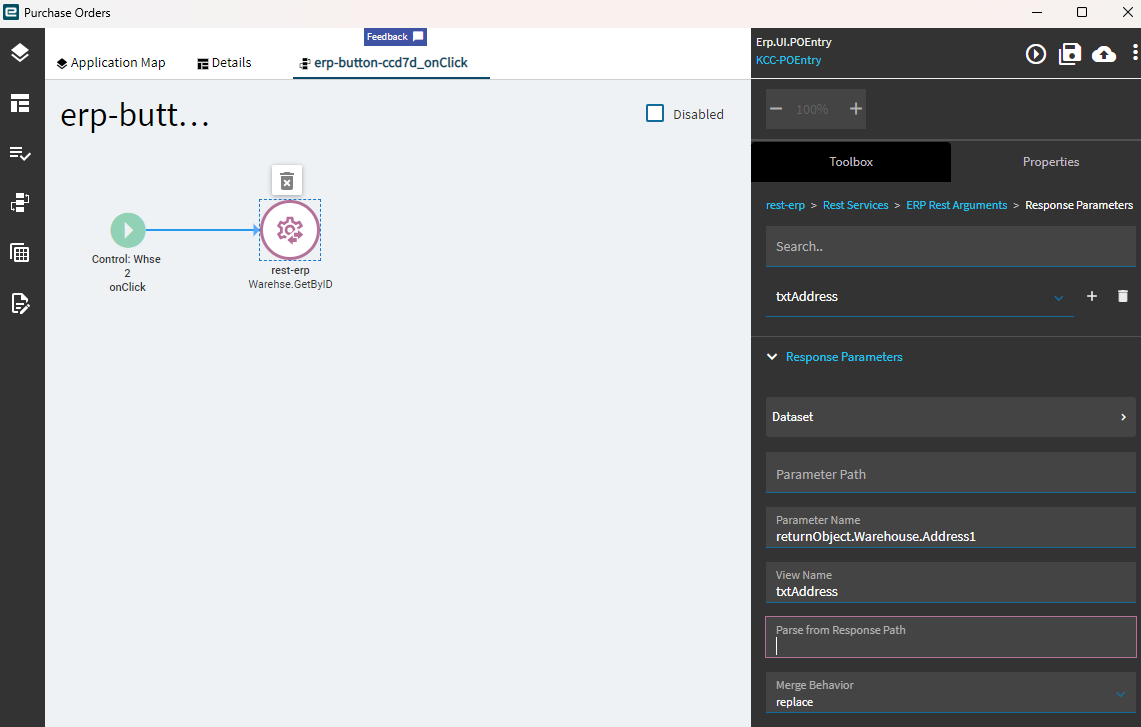 Add the button (labeled Whse2). In the control properties, select Hook On Click, and added a rest-erp widget.