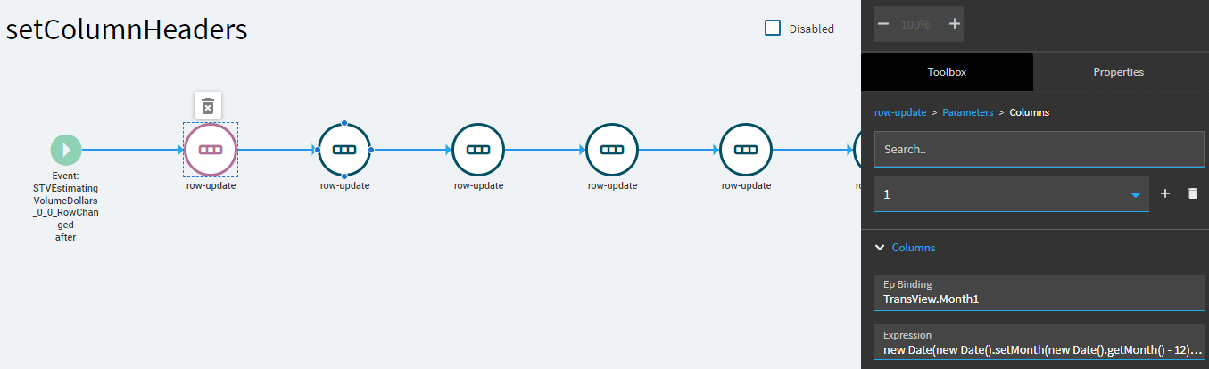 I meant to follow up on this. Yes - I got it to work. So I copied the strategy shown above. There are some bits that I wish were more detailed as I had to figure some stuff out… but basically, I created 12 columns in TransView. Then I set each column’s value using a row-update widget. Then I set the properties of the columns in the grid I want to rename to the values of those TransView columns.