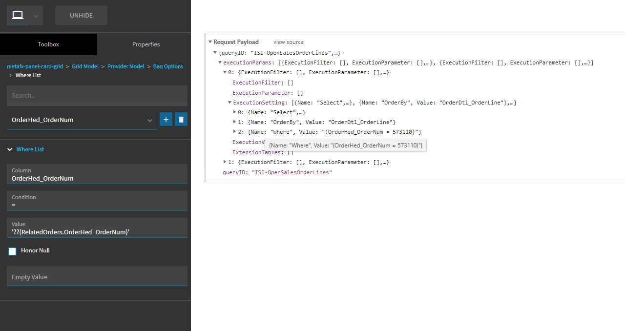One thing I noticed on your BAQ Options, You have a full where clause and on the converted one on my dashboard put the clause in the ‘Where List’ ( the option below the Where textbox with the …) . Let me check if this makes a difference…