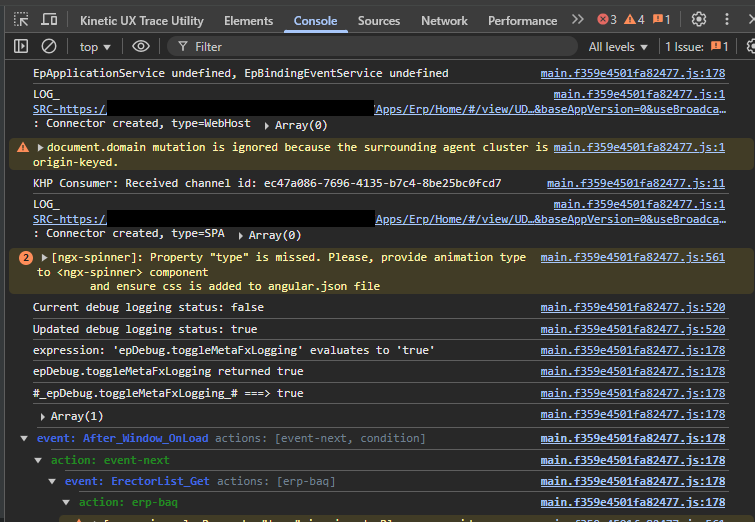 I can either preview from application studio, or open the published dashboard, and when I hit F12 to open the browser dev tools, this is at the top of the console tab.