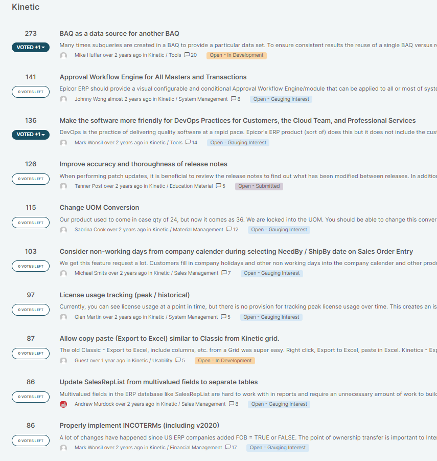 Re the status⦠In Development vs Gaging Interest vs Submitted⦠since this past summer, there has been a hugely growing interest internally with Epicor Ideas, and as such, we have been reengineering how we use these status values. THIS IS STILL A WORK IN PROGRESS⦠so some of the many thousands of ideas still need reset. There have been many discussions around the right way. Also note that Epicor wants ONE approach⦠but at the same time we have many products (P21, Kinetic, CPQ, etc) that also use Epicor Ideas⦠so our approach requires agreement among all product managers.