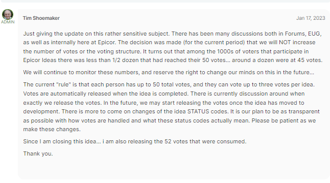 Yep. The idea of limiting votes at all only makes sense in the context of directing resources to true enhancements/new functionality. Like would you rather have this new module or that one. In the Epicor support context, where almost NOTHING is a bug and EVERYTHING is working as designed (no matter how poorly designed it may be), limiting votes is ridiculous. Nobody is going to vote for an idea they disagree with no matter how many votes they have. And its not realistic to use customer vote counts to prioritize the development work, which seems to be how Epicor perceives it. There should be product owners working to understand the problems and prioritize the solutions for development.