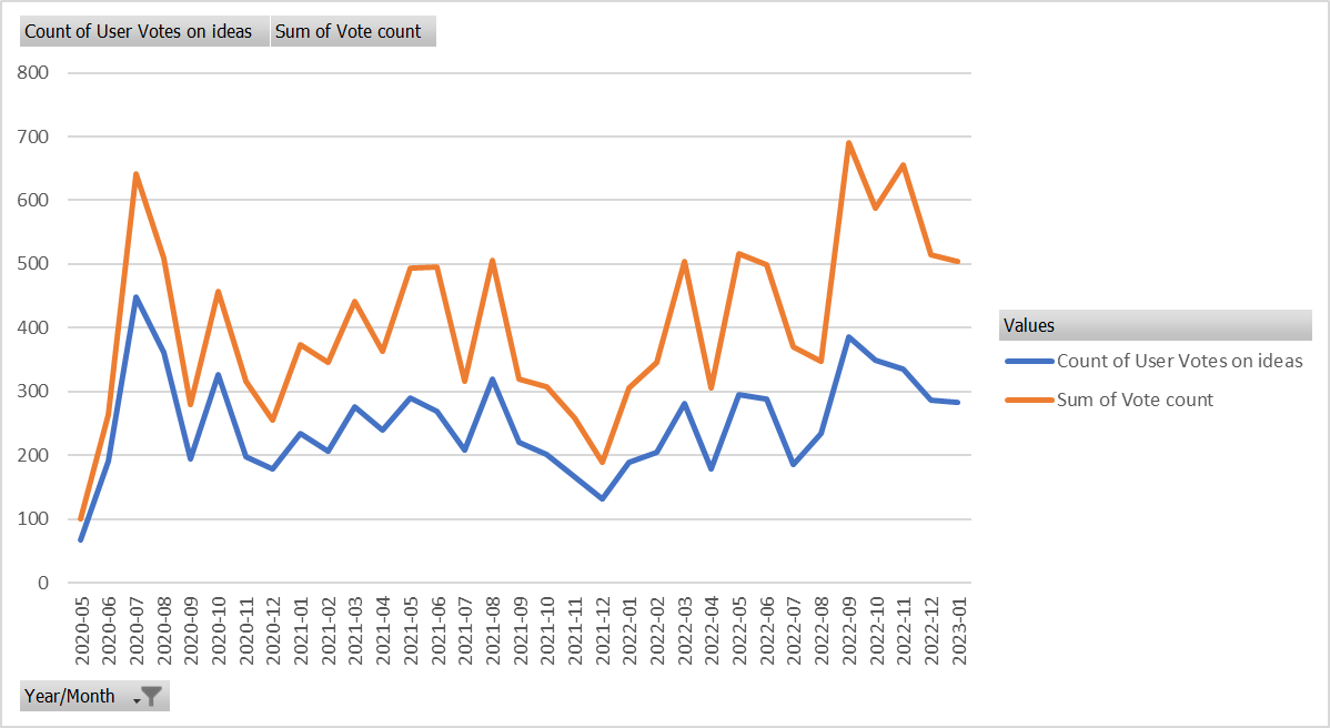 Last Year, on average, we had 268 IDEAS voted on per month, with an average vote count of 470 votes per month (totally 5643 total votes last year alone). This month so far we have seen 283 users add new votes to ideas for a total of 504 votes (above average month).