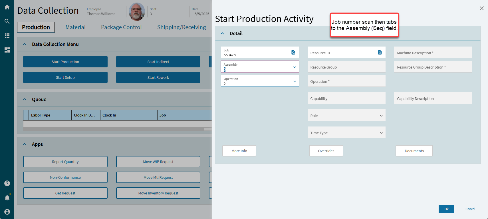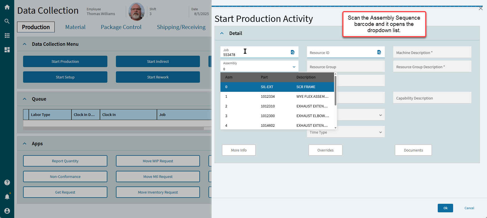 At this point, the only thing we can use the barcode for is the job number. Ideally, I would like to scan (job number), scan (assembly sequence),scan (operation sequence), click OK, and that’s it. If not for the behavior of the drop down fields, we’d be there. Does anyone out there have a solution for scanning a value into a dropdown field?