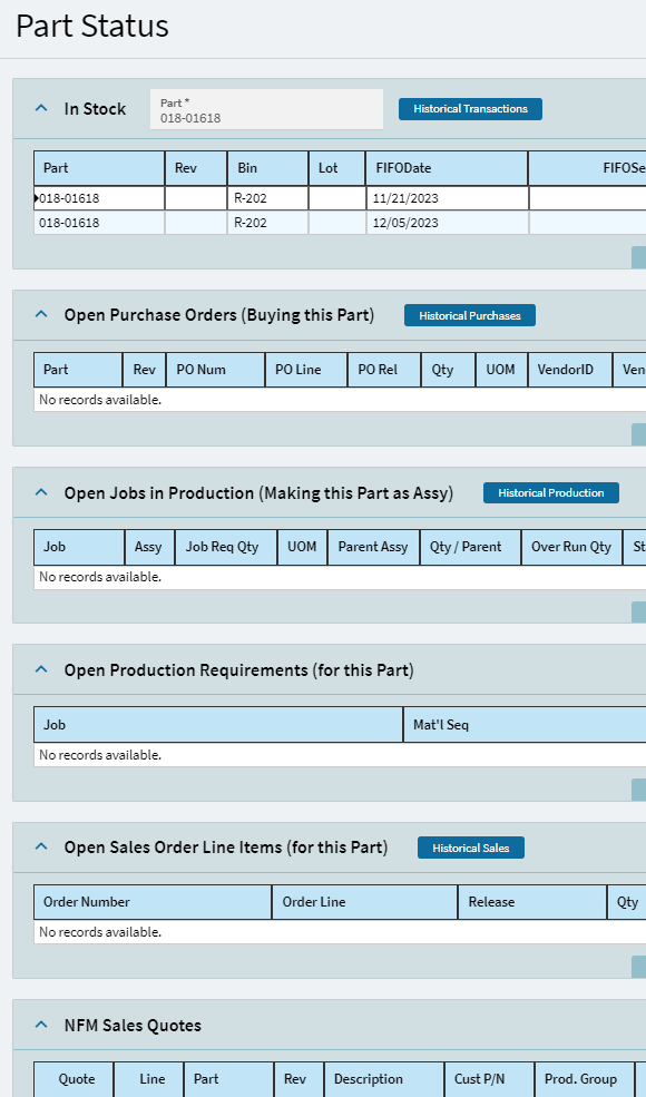 We created a dashboard like the below that has multiple grids to show current information/status. Then, each has a button that the user can use to see historical records (transactions, purchases, production, sales, quotes, etc.). Again, this was created to hopefully eliminate the user’s need to visit 3 different trackers to find the information then needed.