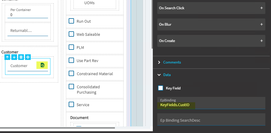 How do I create a Text Box search field that binds to a custom UD field to search on Customer ID and pull in the Customer.Name into the UD field? Do I need to add a behavior for On Search Click? I have checked Enabled Search under the Advanced section.
