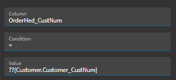 Setting the Where-Clause on the child grid’s Where clause to "OrderHed = “OrderHed_CustNum = ?{OFB_CustomerApp.Customer.CustNum}”