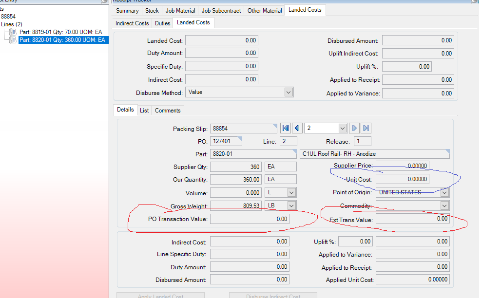 Also the Unit Cost has a value of zero (blue below)