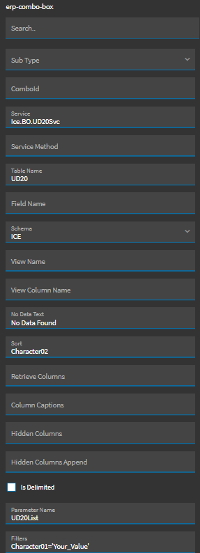 You’re exactly right. I am not using Kinetic interface at the moment but I am doing just that. I don’t want to have to set it on each combo box if there’s an easier way. That’s all. I am asking if there is an easier way or if I’m just stuck having to manually setup each combo box for standard UD table columns (ShortChar01, ShortChar02, etc.).