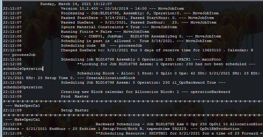 What I would be more interested in would be something like the logging options available when running MRP or Global Scheduling. When scheduling from job entry, I haven’t been able to find any logs… guessing they just don’t exist.