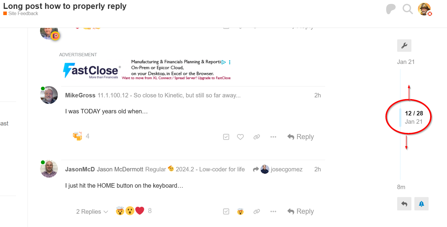 Note to navigate the entire post, in addition to the HOME and END (Which I just leared above), you can also drag around the little elevator button at the right. This is what i have been doing on āthe large postā to get to specific posts i wanted to find.