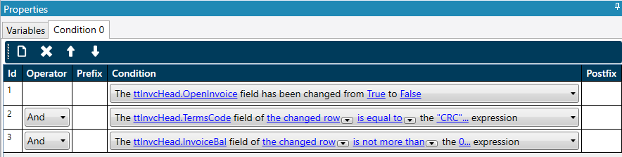 You need an In Transaction Data directive to monitor for the invoice status changing from open to closed, and some other criteria to ensure it’s a credit card invoice. I used a condition to ensure the GroupID begins with the values setup in Company Config for the Credit Card Invoice Group, most likely CC.