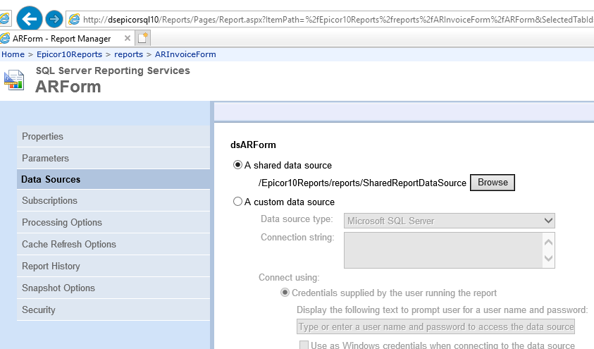 It is also important that you understand that the database that is being pointed to here is NOT the application database. This is a temporary reporting database. If you are trying to change where your application server is pulling this data from then, you would do that in the web.config of your application server. This is a very different question then we are answering here.