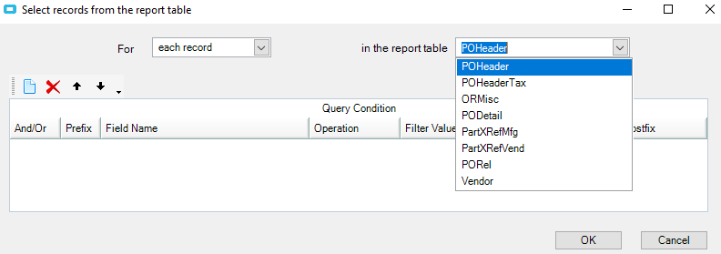 The idea is that you take row from your report table, probably POHeader, then use value of that row in the Take Attachment.