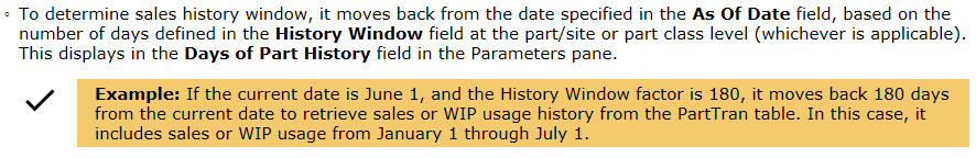 Yes, the ‘As Of Date’ is the date it works back from. The number of days to look back from this date is set using the ‘History Window’ at either part class or part level.