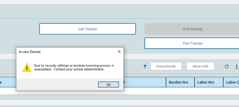 We are facing the “Due to security settings or module licensing process is unavailable.” in MES Kinetic.