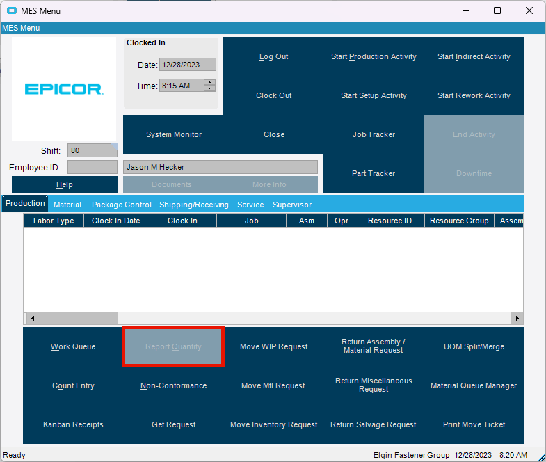 The “Report Quantity” button in MES is disabled if the user is not logged into any Production Activity. According to Epicor Help, that is the intended function.