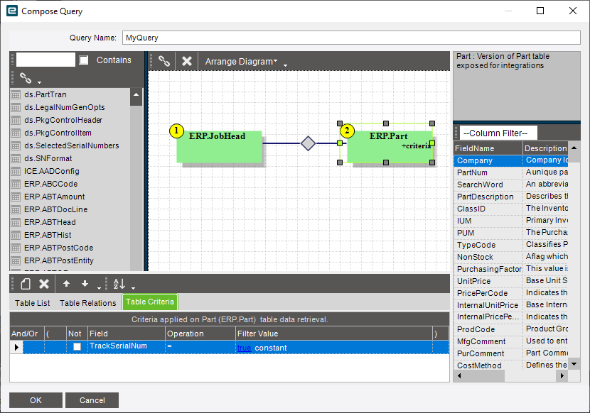 Pull your ds.PartTran into your query and match it to either jobhead on jobnum or part on partnum.