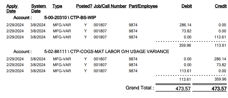 My question is why is the MFG-STK amount used to calculate the usage variance balance? Is there a reason why the MFG-STK is used and not the estimated amount found in the Production Detail report?