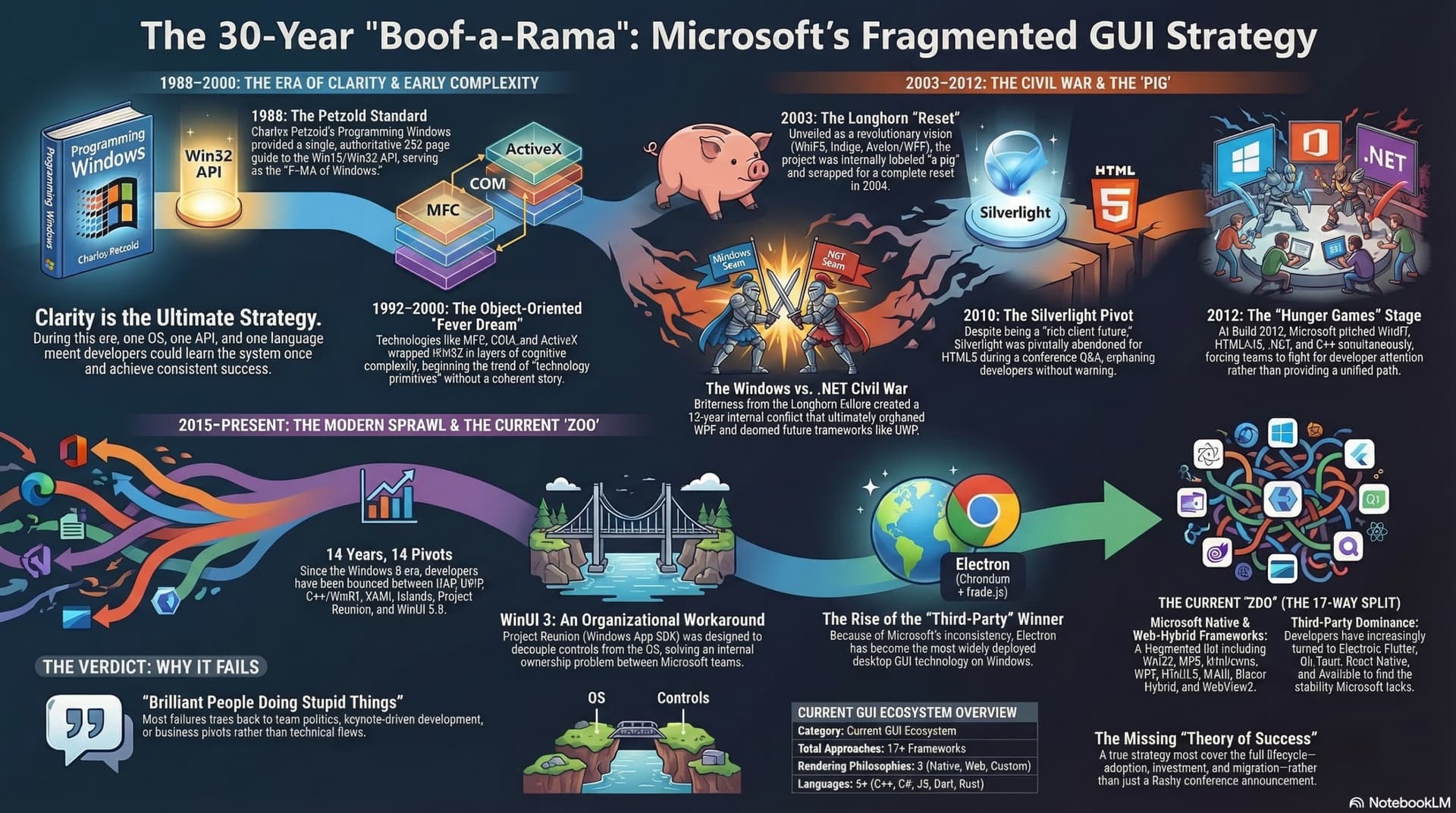 MFC (1992) – C++ wrapper on Win32. Maintenance mode. Lives in enterprise and CAD.