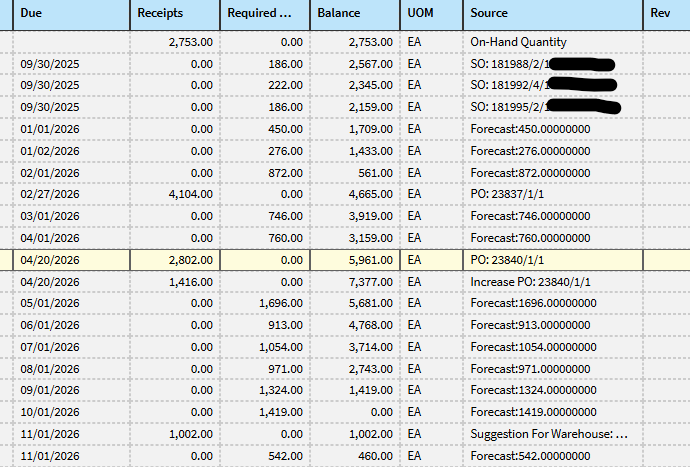We have PO 23840 for a part due 4/20, where we expected a postpone suggestion to 07/01, since our demand for this part dropped for Q1. Instead of a postponement, we are seeing an Increase for this to ostensibly cover us through October.