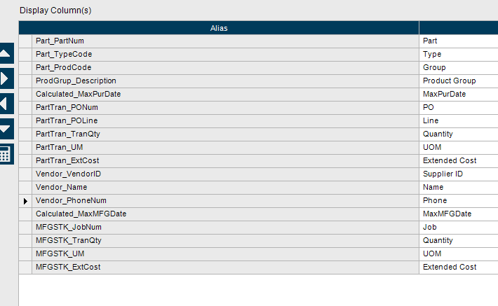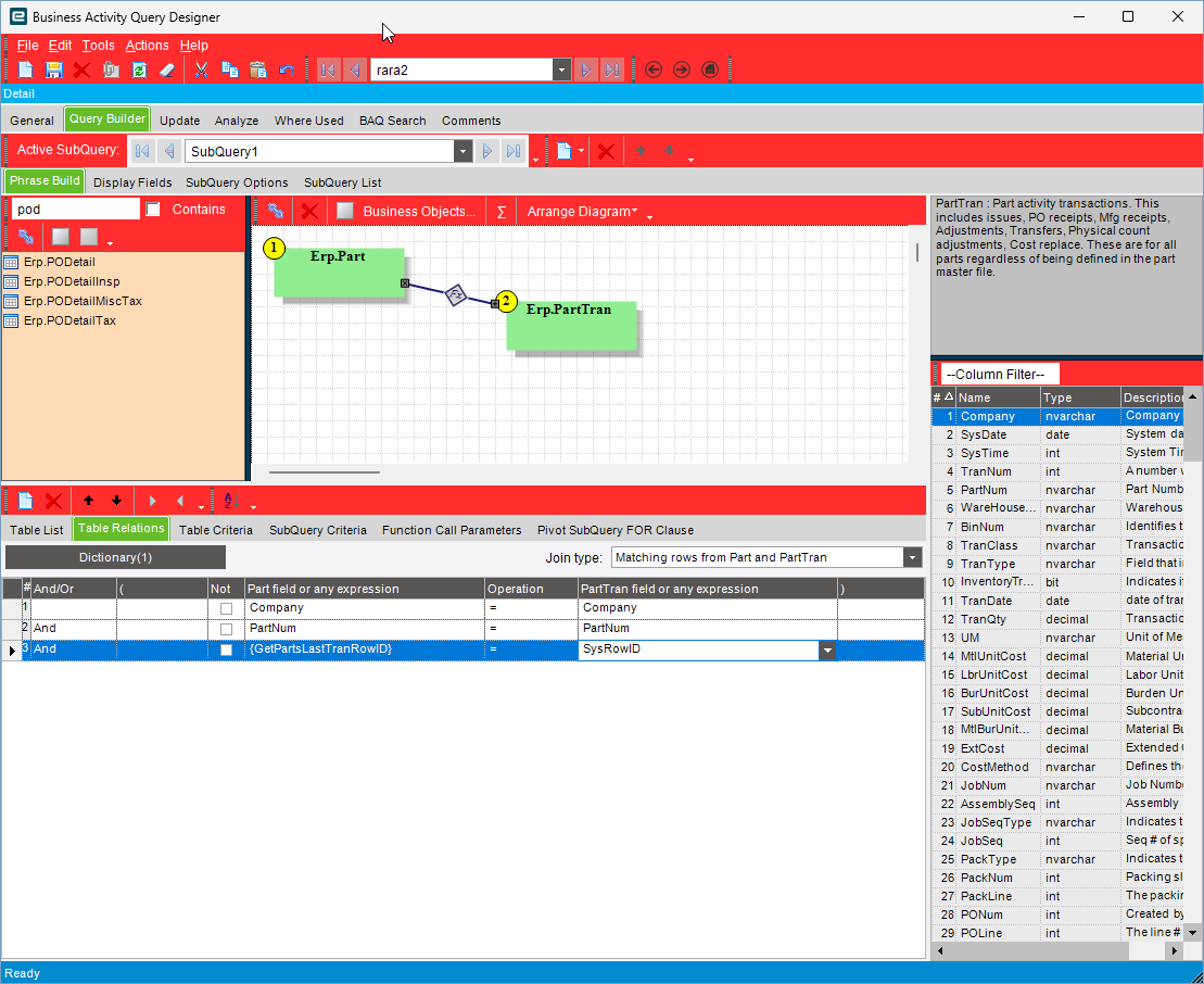 I started with Part and added a sub-query for Purchase transaction using PartTran and filtering for PUR-STK. I linked the two queries and made a calculated filed in the top query for max(PURSTK.PartTran_TranDate).