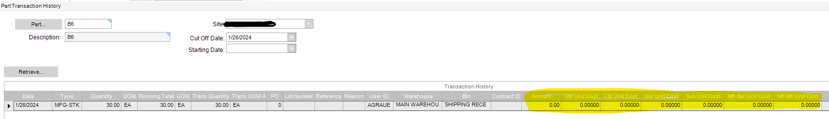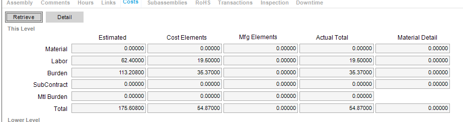 We made a job to inventory with a production qty of 1. The sub-assemblies on this job need to be issued to inventory to be issued to production jobs. I have that part down. The job/quantity were marked as complete and issued to stock (MFG-STK). Then each assembly is being issues to stock (MFG-STK). The issue is that I am not seeing any of the labor and material costs moving with those parts. I would expect to see the costs come off the inventory job when the sub-assembly is issued to stock but it is not. Our company config for parts is STD and so are all the parts. What am I missing that needs to happen to fix this? Screen shots below show that the costs on the sub-assembly are the same before AND after issuing them to stock and the other is the sub-assembly parts in inventory with no costs associated with them.