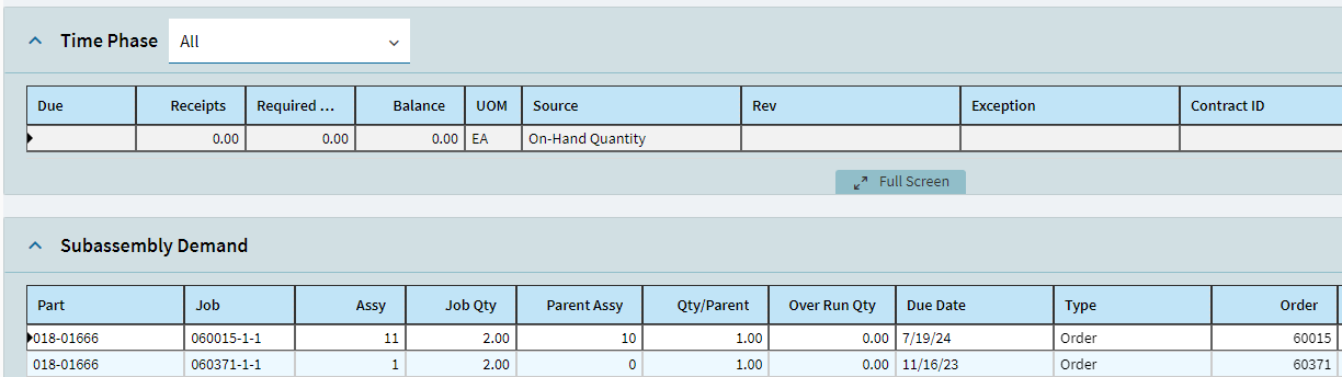 Out-of-the-Box Time Phase shows (0) on-hand, and (0) demand… but the bottom (new) grid shows this part is actually being produced as subassemblies on a couple different jobs.